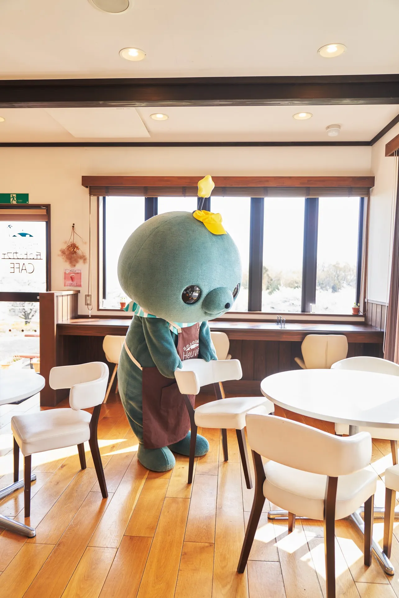 お店のエプロン&帽子を被り、アルバイト開始。椅子を並べるくらいしか任せられる事がなさそう。