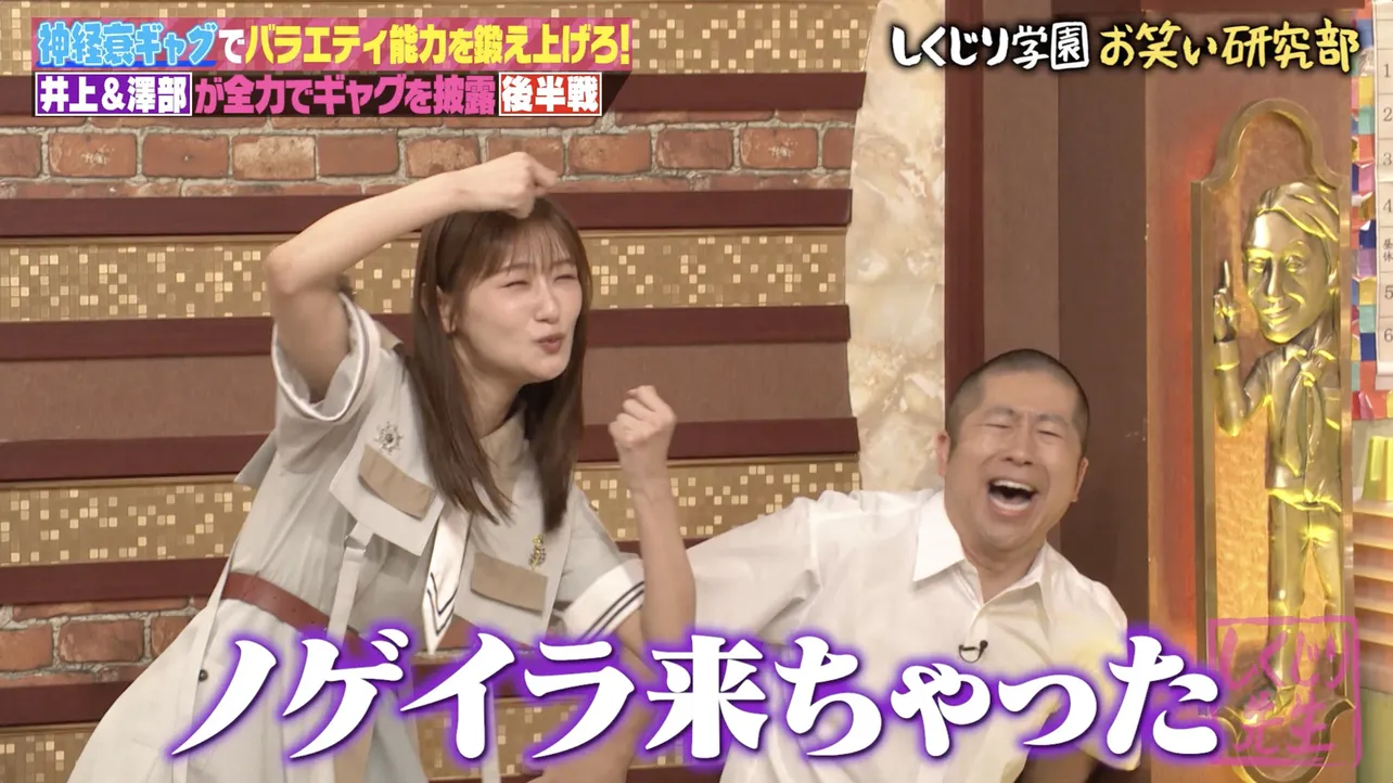 “神経衰ギャグ”は、芸人の顔と名前を一致させる神経衰弱風のゲームで、正解すると指名した相手が該当芸人のギャグを全力で披露するルール。櫻坂46の4人は、しくじり学園「お笑い研究部」のメンバー、オードリーの若林正恭、平成ノブシコブシの吉村崇、ハライチの澤部佑、アルコ&ピースとペアを組み、前回決まった山﨑×若林、武元×吉村、井上×澤部、大園×アルコ&ピースという組み合わせでゲームに挑戦した。