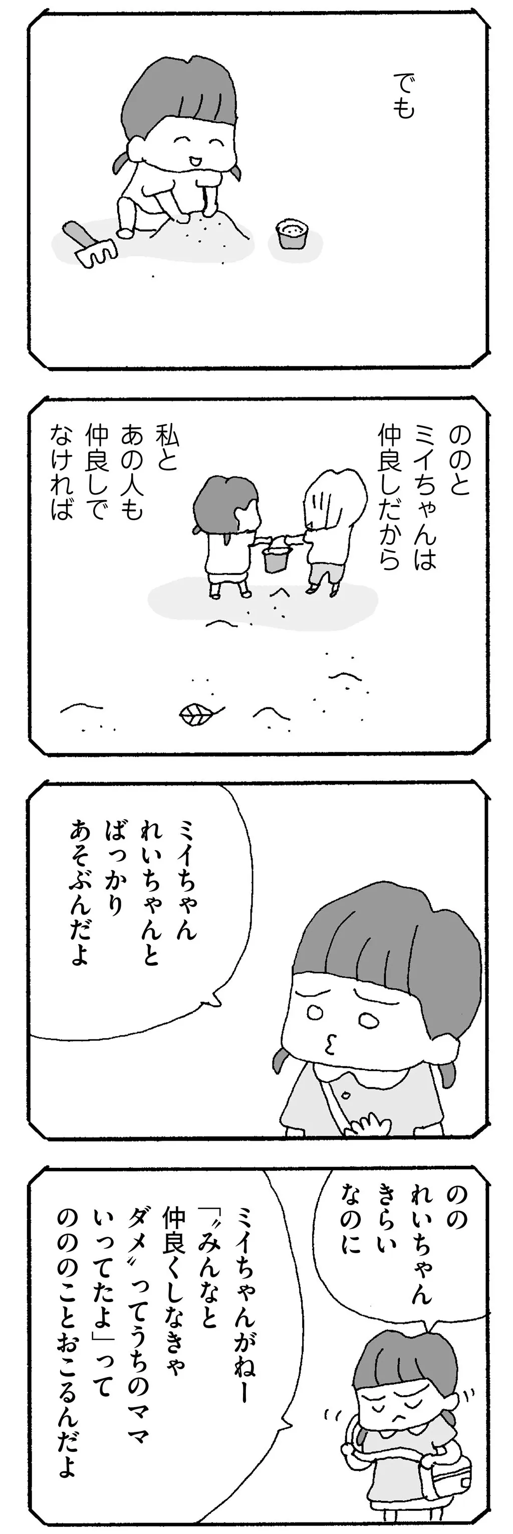 ある日、1番仲が良かったママ友から無視をされた――。主人公のサキは、幼稚園に通う娘のミイちゃんと夫との3人暮らし。ミイちゃんが幼稚園に入園したとき、初めてできたママ友が、ののちゃんのママ・リエちゃんだった。2人は子どもたちも交えて毎日一緒に遊ぶほど仲が良かったが、ある日突然、サキはリエから無視されるようになる。理由に心当たりがないサキが他のママ共に理由を聞いてみると、どうやらリエに誤解されているようで…!? 一方で、リエの中でもサキに対して複雑な思いがあった。果たして、2人の関係はどう動いていくのか…?