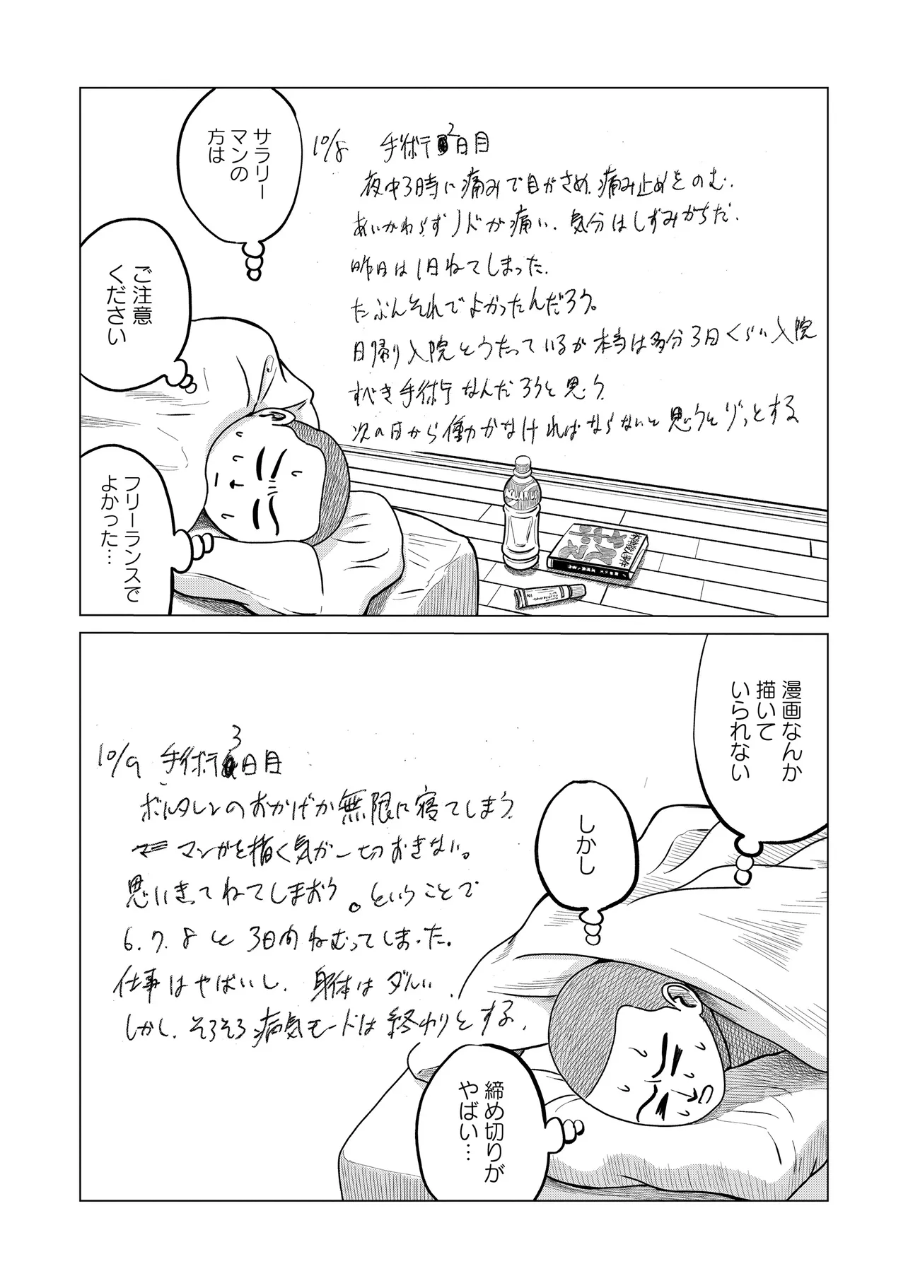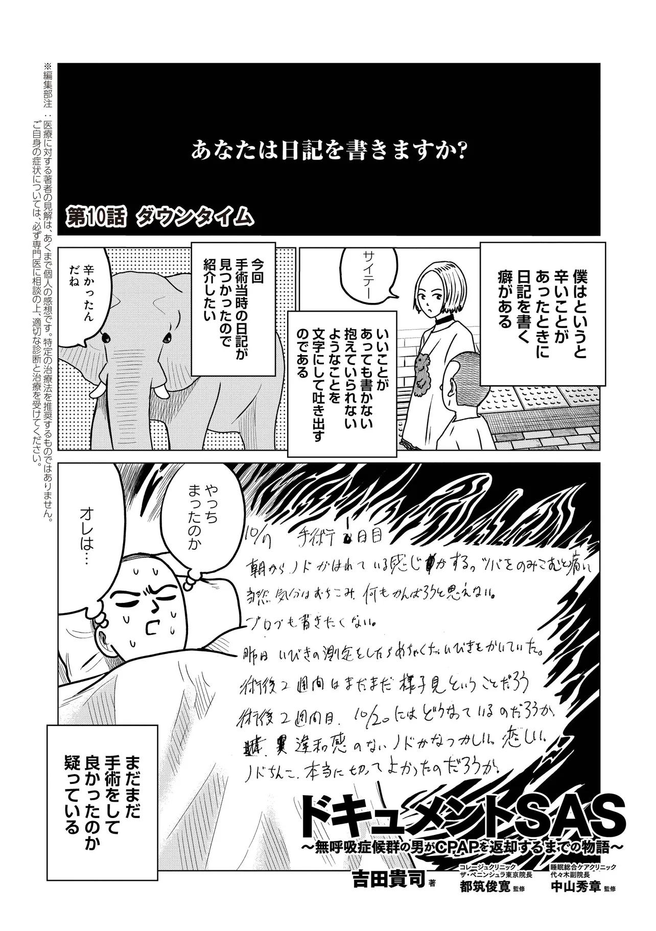 「SAS=睡眠時無呼吸症候群」と診断された漫画家・吉田貴司が、自身の治療体験を赤裸々に描いた実録ドキュメンタリー。治療を始めたきっかけから、過程、そして卒業まで…“いびき”と向き合う姿を笑いと学びを交えてお届け! 手術後のダウンタイムの様子を、当日の日記を交えてリアルに紹介。