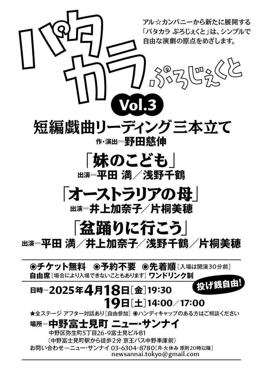 ニューサンナイで上演されたパタカラぷろじぇくと短編リーディングは、無事千秋楽を迎えました。