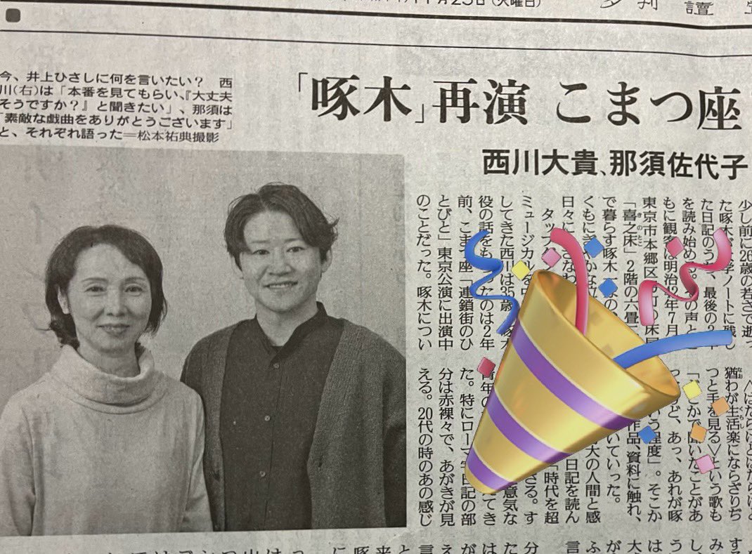 本日11月25日の読売新聞夕刊に 西川大貴くんとのインタビュー記事が掲載されています‼️ #泣き虫なまいき石川啄木 #こまつ座 #西川大貴 https://t.co/V6eiYa4EHJ