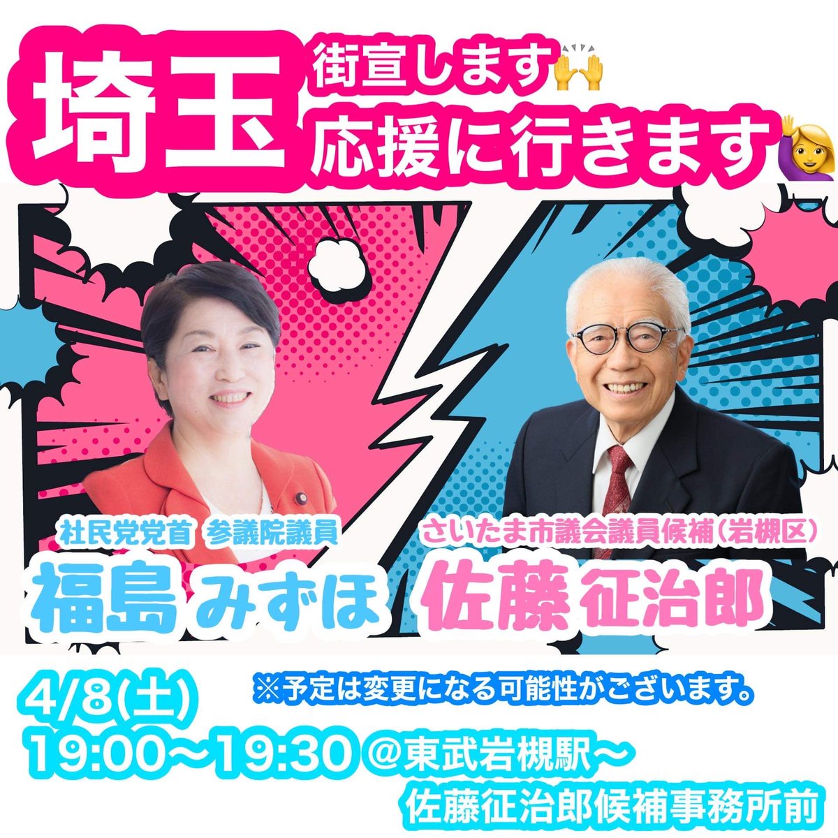 4月8日(土)は埼玉に行きます。 さいたま市議会議員選挙に岩槻区から立候補している佐藤征治郎さんの応援です。ぜひ来てください。 https://t.co/4pPV0Hq0hb