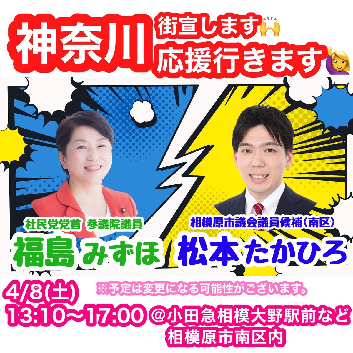 4月8日(土)は神奈川に行きます。相模原市南区から市議会議員に立候補している松本たかひろさんの応援です。ぜひ来てください。 pic.twitter.com/6BmGPa2TRh