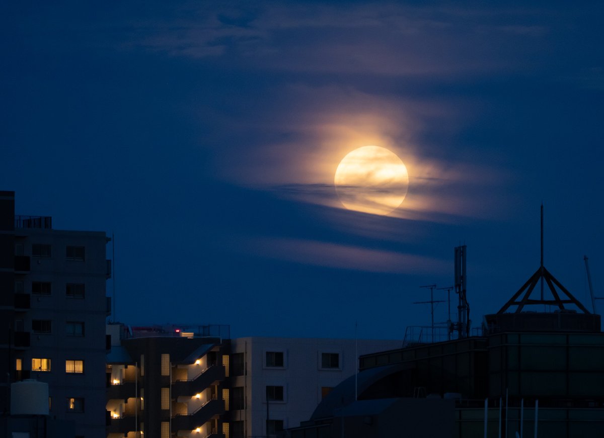昨夜の満月の出 曇り空でダメかなと思ってたけど、モワッと出てきた満月 アメリカ先住民の呼び方によると #フラワームーン 花が咲き乱れる季節だかららしい #満月 #満月の出 https://t.co/qHzBlGCeOc