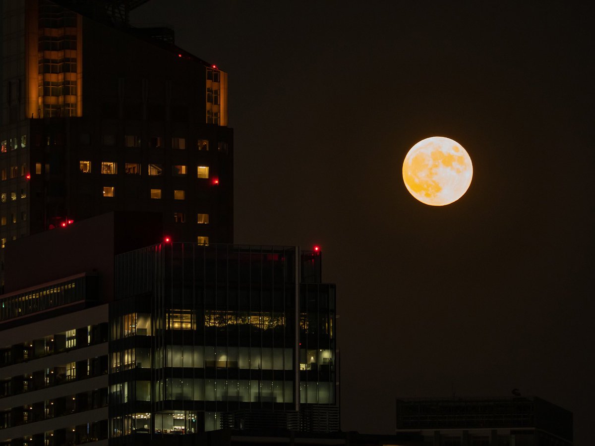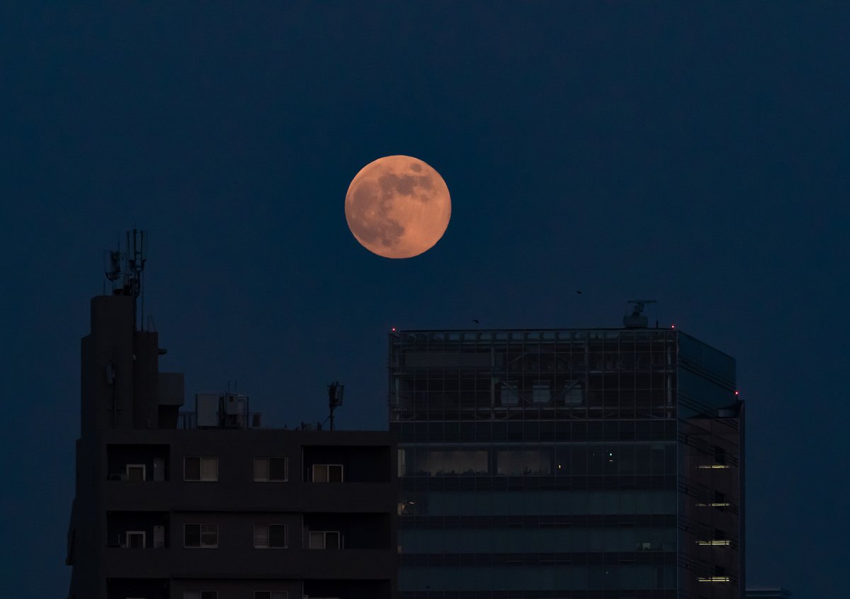 今日の月の出@東京 昨日の月の出よりも丸いかな 今夜はこれからゆっくり欠けていく模様 しかしさすがスーパームーン、でかい #満月 #スーパーブルームーン #月の出 https://t.co/kys1iThLEv