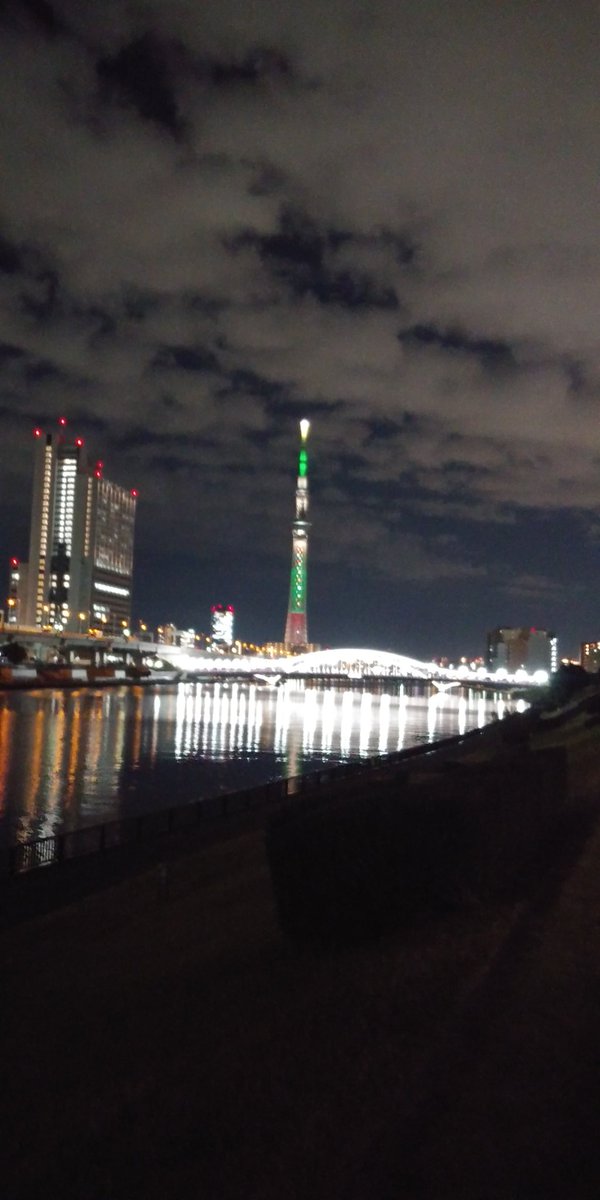 夜のモロ散歩。ちょっと寒いけどスカイツリー見ながらしみじみクリスマス気分に。 空見上げ 平和願う ツリーかな https://t.co/eiJYpPkz0h