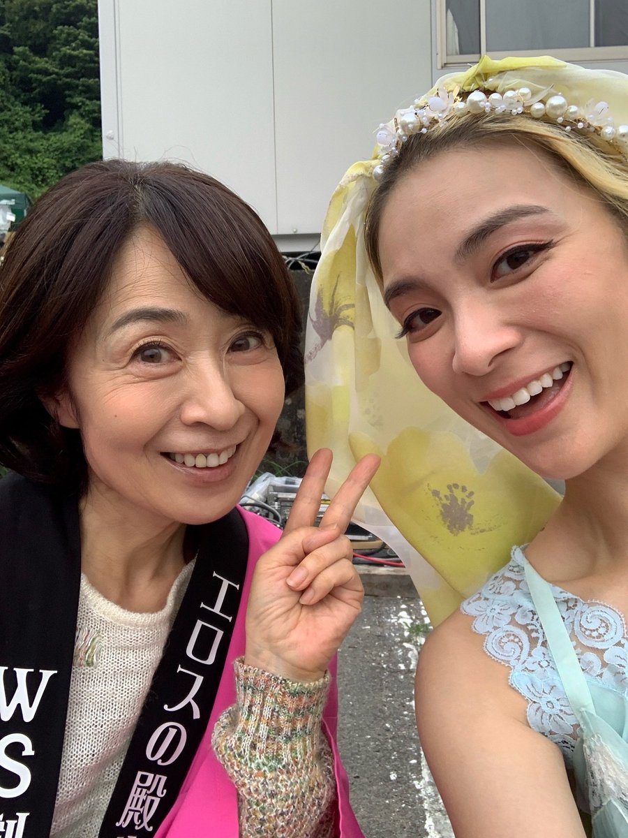今週はもう10話ですねー。 この写真はオープンセットが建っていた5月に撮ったものですが、 あの時は山の中で、お天気も悪くて寒かったな〜😢 と言いつつ、ハーミアの攻めてる格好をしている才加ちゃんとパチリ。 懐かしいですぅ😊 #もしもこの世が舞台なら楽屋はどこにあるのだろう #秋元才加 https://t.co/oRVDDzqUzm
