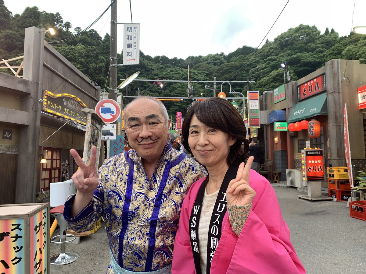 後ろが森の八分坂! 郊外の山奥に建てられたオープンセットでした! 「夏の夜の夢」イージーアスに扮した夫、大門さんとパチリ。 さあ、明日の10話はどうなるのでしょうね?お楽しみに💕 #もしもこの世が舞台なら楽屋はどこにあるのだろう #もしがく #野添義弘 https://t.co/DGC3c57Gwl