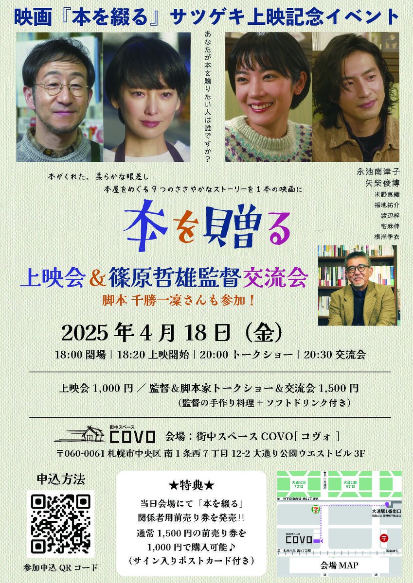4/18からサツゲキにて「本を綴る」が公開になります。前作に当たる「本を贈る」映画版を当日は別場所で上映することに。さらに交流会で前売り券販売などいたします。今回は会場にキッチンあり、僕が40年くらい作り続けているパスタも出してみることにしました。 pic.twitter.com/7DcaHM1sLG