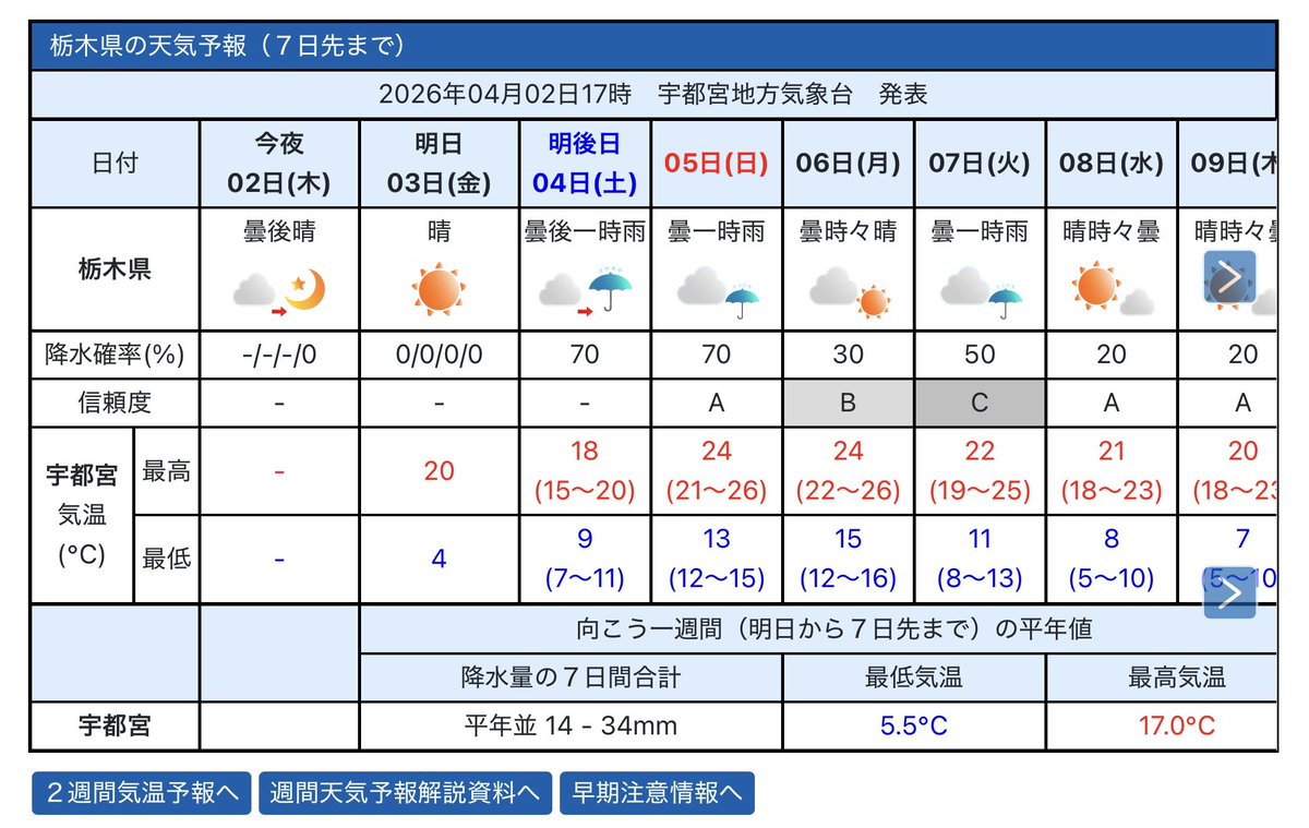 明日開幕するスーパーフォーミュラ サーキットがある茂木周辺の栃木県南部の 気象庁発表の最新の天気は 明日 晴れ 土曜 曇りのち一時雨 日曜 曇り一時雨 信頼度A 明日は高気圧に覆われそうですが 土曜日から日曜日は天気が崩れそうです #sformula https://t.co/DxJIbEKCOk