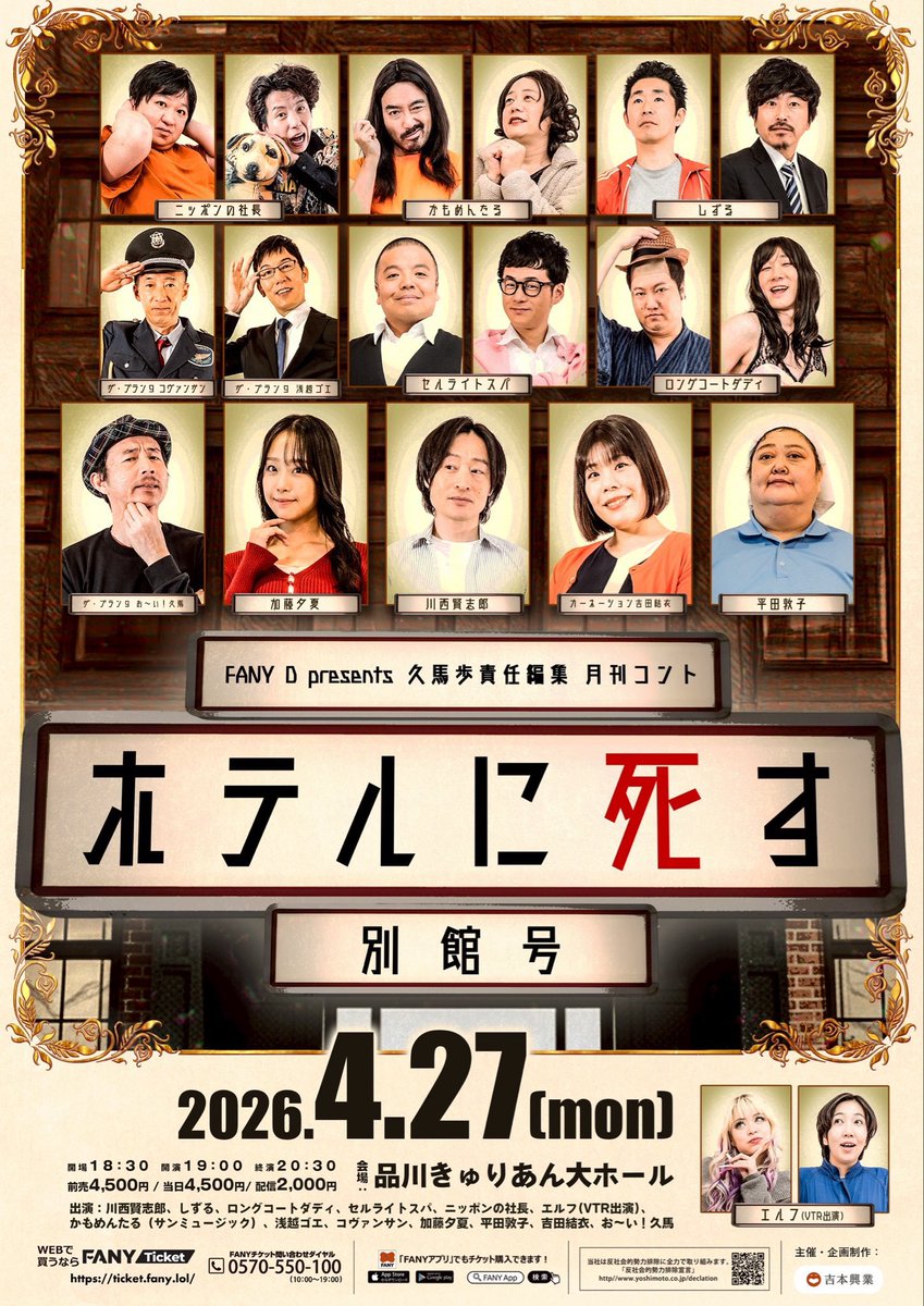 4/27(月)19:00 FANY:D presents久馬歩責任編集 月刊コント きゅりあん大ホール 出演 川西賢志郎 しずる ロングコートダディ セルライトスパ ニッポンの社長 エルフ(VTR出演) かもめんたる 浅越ゴエ コヴァンサン 加藤夕夏 平田敦子 吉田結衣 お〜い!久馬 https://t.co/ra4ff2r9BP https://t.co/zxAvFrNs9l