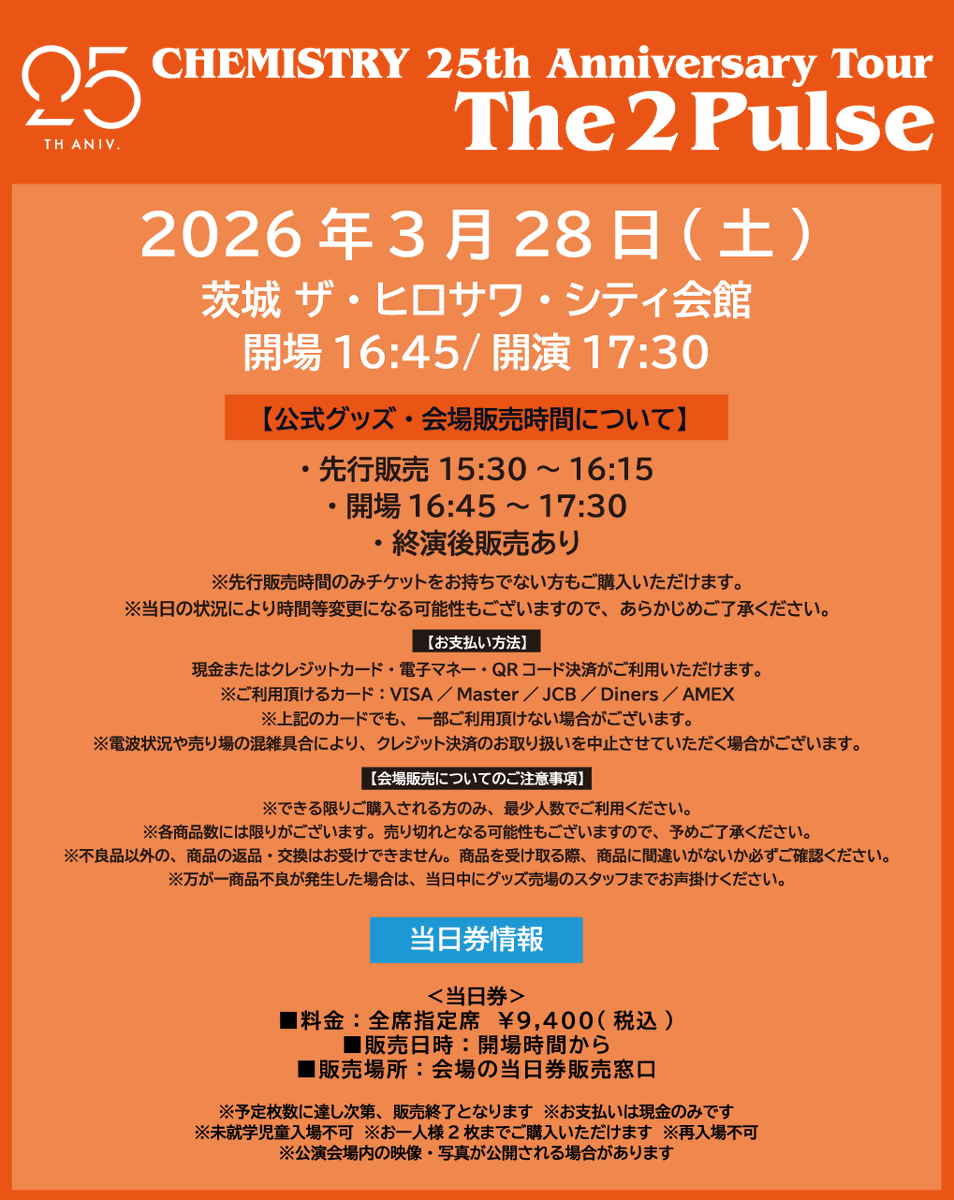𝐂𝐇𝐄𝐌𝐈𝐒𝐓𝐑𝐘 𝟐𝟓𝐭𝐡 𝐀𝐧𝐧𝐢𝐯𝐞𝐫𝐬𝐚𝐫𝐲 𝐓𝐎𝐔𝐑 「𝐓𝐡𝐞 𝟐 𝐏𝐮𝐥𝐬𝐞」 🌹茨城公演🌹 🔻3/28(土) 茨城 ・ザ・ヒロサワ・シティ会館 開場16:45/開演17:30 🎫当日券あり ■料金:全席指定席 ¥9,400(税込) ■販売日時:開場時間から ■販売場所:会場の当日券販売窓口 https://t.co/9RnCX3fv3n https://t.co/eftbMbdWxv