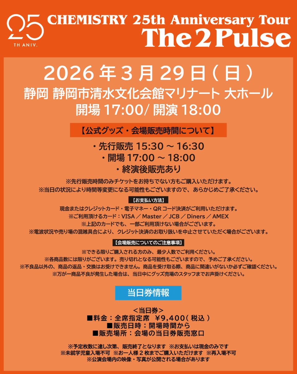 𝐂𝐇𝐄𝐌𝐈𝐒𝐓𝐑𝐘 𝟐𝟓𝐭𝐡 𝐀𝐧𝐧𝐢𝐯𝐞𝐫𝐬𝐚𝐫𝐲 𝐓𝐎𝐔𝐑 「𝐓𝐡𝐞 𝟐 𝐏𝐮𝐥𝐬𝐞」 🍃静岡公演🍃 🔻3/29(日) 静岡・静岡市清水文化会館マリナート 大ホール 開場17:00/開演18:00 🎫当日券あり ■料金:全席指定席 ¥9,400(税込) ■販売日時:開場時間から ■販売場所:会場の当日券販売窓口 https://t.co/KD4zqW3YwI https://t.co/eftbMbdWxv