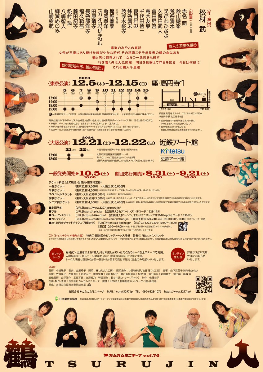 #カムカムミニキーナ 「#鶴人」 12月5日初日です! 早いとこ、来る日を決めて、 チケットご予約お願いいたします! 私は薄ら禿頭をフル回転させております! カッコイイ鶴人Tシャツも、 劇場にてお求めくださいませ! https://t.co/xH4uwKwLkv (東京公演チケットフォーム) https://t.co/pJJatDX6y8 https://t.co/6fPNk0YueT