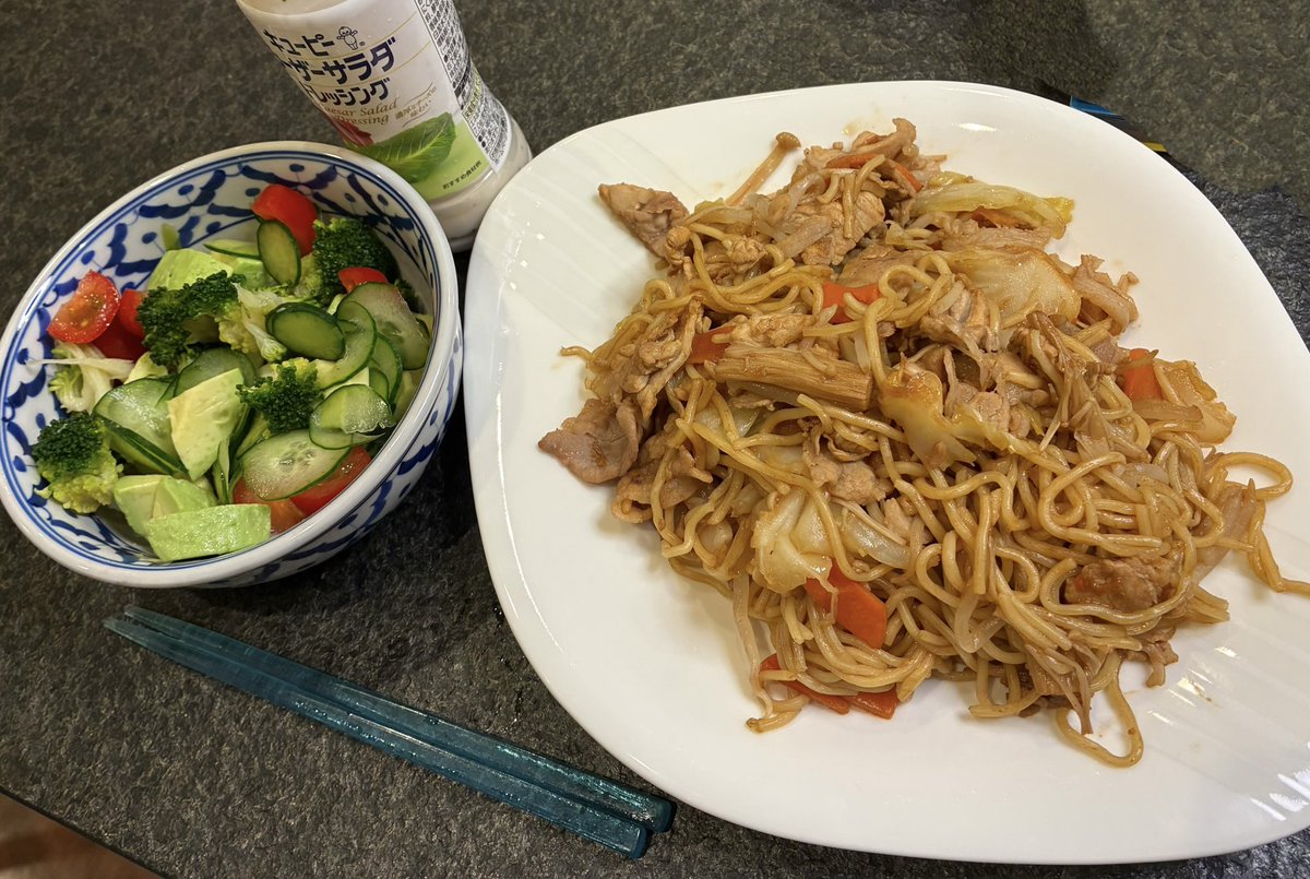 小1長男が爆食いしたほぼノンオイルな時短焼きそば!炊飯器にカット野菜、えのき、麺の順に投入。酒・ごま油・鶏がらスープの素を大さじ1ずつ振りかけて早炊き。豚肉は沸騰したお湯に砂糖・塩を大さじ1入れてしゃぶしゃぶ。余分な油を落としたら切って麺と合体。付属の粉末ソース・塩で味を整える👍 pic.twitter.com/7RxSu0nSf7