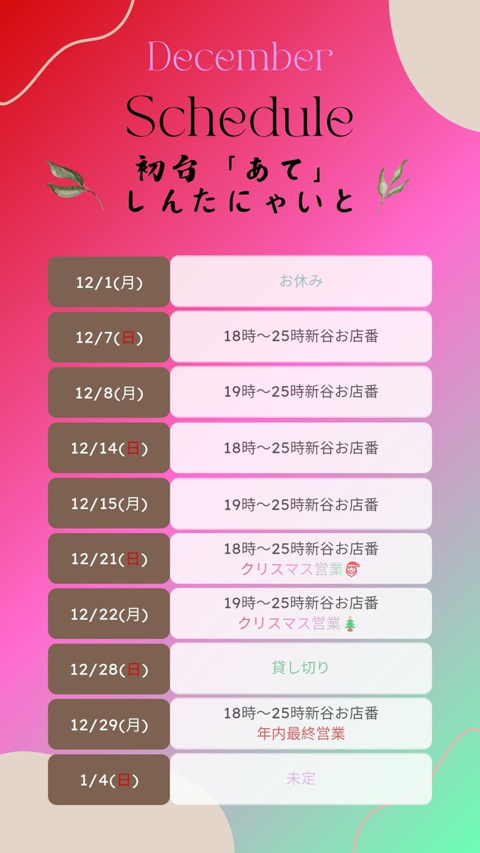 12月 初台「あて」お店番スケジュールです👇 本日は新谷お仕事によりお休み頂いております🙏 サポートで誰に入ってもらうか確定したらまたお知らせしますね👧👩👱👯 12/28(日)は貸し切り予定です。 こんなにがっつり毎週入るの久しぶりすぎて ガラガラだったら寂しいので 遊びに来て下さいね😂💛 https://t.co/enDwtOyNd2