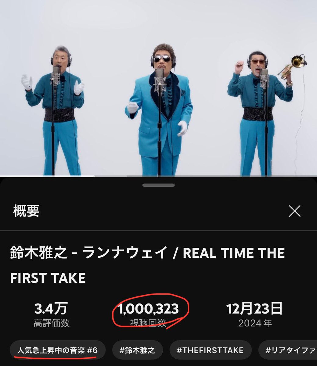 【鈴木雅之 / #THEFIRSTTAKE 】 Thanks, All Viewers🌏 . 1,000,000 🙌 ランナウェイ ▶️https://t.co/4JoVJcz2Tq . 4,000,000 🙌🙌🙌🙌 め組のひと ▶️https://t.co/X5dzxaQZ8e . なんと 2曲同時急上昇チャートランクイン📈 @The_FirstTake #ラッツアンドスター #鈴木雅之 #佐藤善雄 #桑野信義 https://t.co/aMI12XfAmh