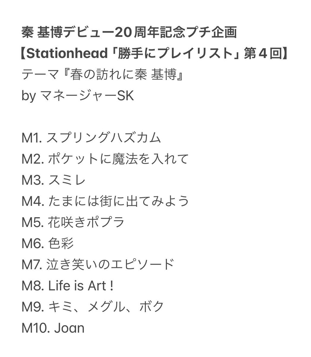 本日20:00〜!! #秦基博 スタッフによる #Stationhead 「勝手にプレイリスト」企画🎧✨ 第4回はマネージャーSKによる〖春の訪れに秦 基博〗を配信します! ぜひお聴きください🌸 #hata20th https://t.co/L7xK6DB7py