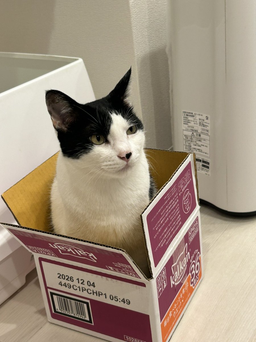 あの、ご本人はピッタリサイズだとご満悦のようですが どう考えても箱の方が小さいかと。 https://t.co/r7EMtn0jCY