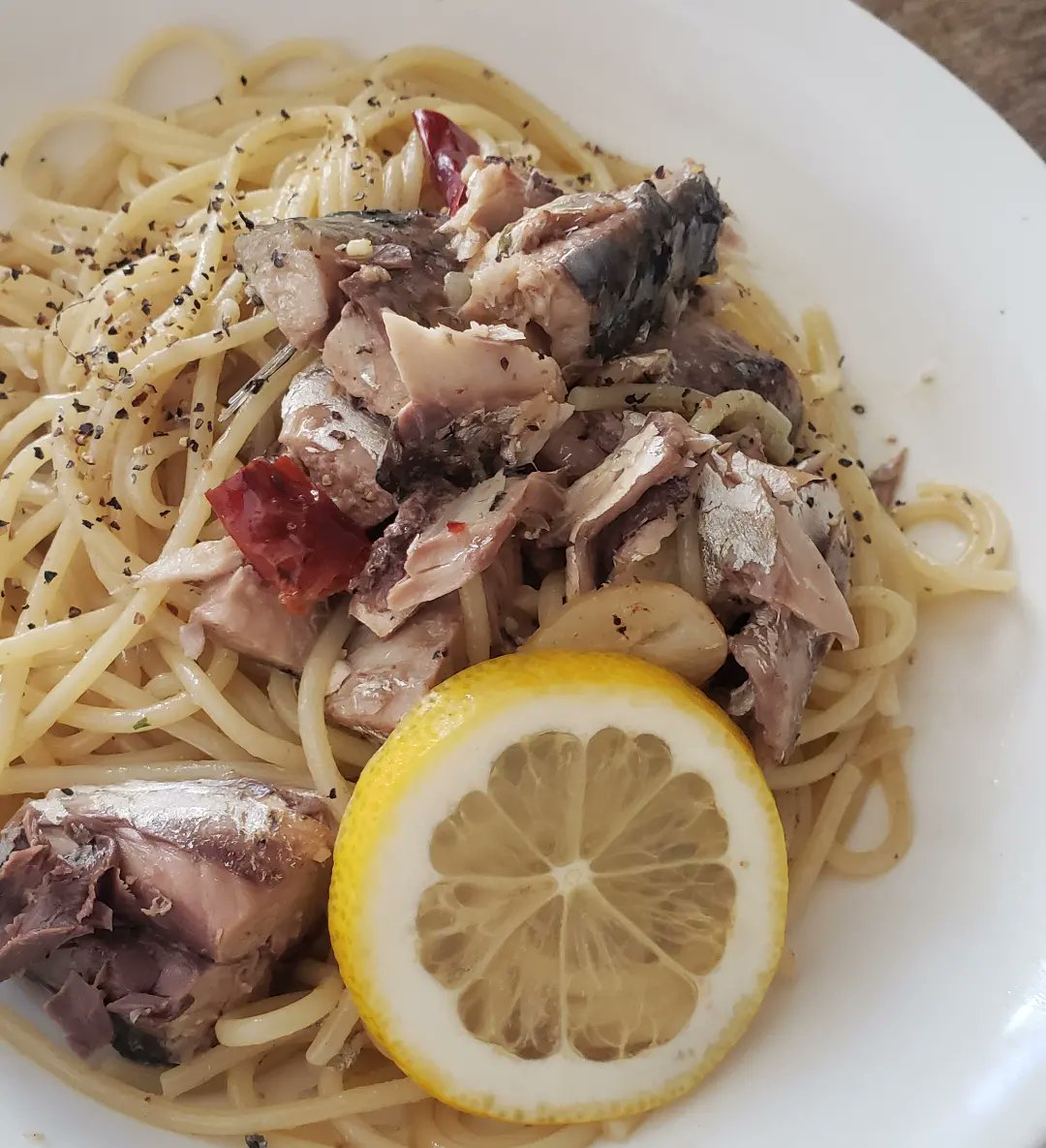 にんにくと鷹の爪、サバ缶を汁ごと炒めてパスタに絡め、レモンをぎゅっと。