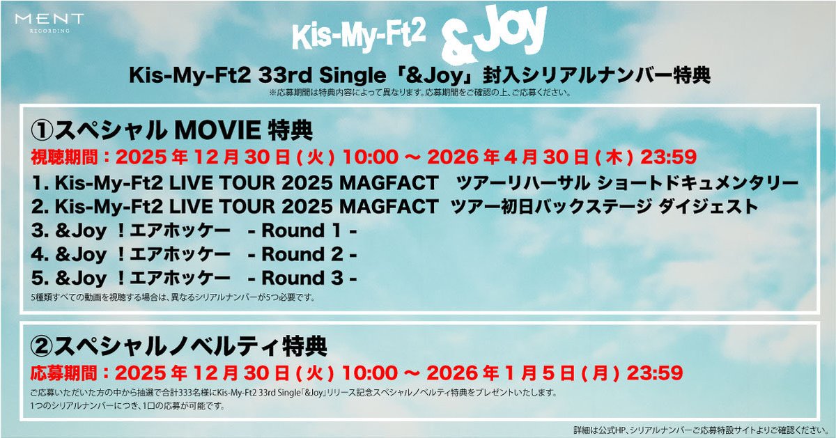 [📣] #KisMyFt2 33rd Single '&Joy' 封入シリアルナンバー特典 🎥スペシャルMOVIE特典 🎁スペシャルノベルティ特典(抽選) スペシャルノベルティ特典へのご応募は 明日、1/5(月) 23:59まで⚠️ お忘れなくご応募ください💁♂️ ( https://t.co/Q53hIgneuz ) #キスマイ #キスマイとエンジョイしよ https://t.co/XWUhZfxER5