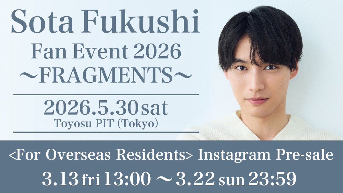 \お知らせ📢/ 福士蒼汰ファンイベント2026 〜FRAGMENTS〜 Instagram先行受付(抽選)は本日23:59締切です!⏰ https://t.co/PIpLCLKyxi たくさんのご応募お待ちしております🙂↕️ #FRAGMENTS #福士蒼汰 https://t.co/wLveJgk59s