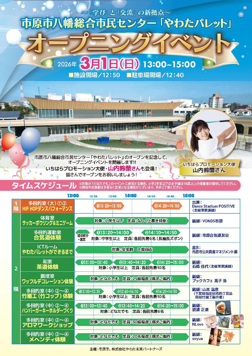 【お知らせ】 千葉県市原市に総合市民センター「やわたパレット」が3月2日にオープンします☺️🫶 明日はオープニングセレモニーにて、司会進行を務めます🎤 市原市にお住まいの方💕 県外から来られるお客様も🌹 是非「やわたパレット」にてお待ちしてます! #千葉県市原市 #やわたパレット https://t.co/kgUGPkCOKM