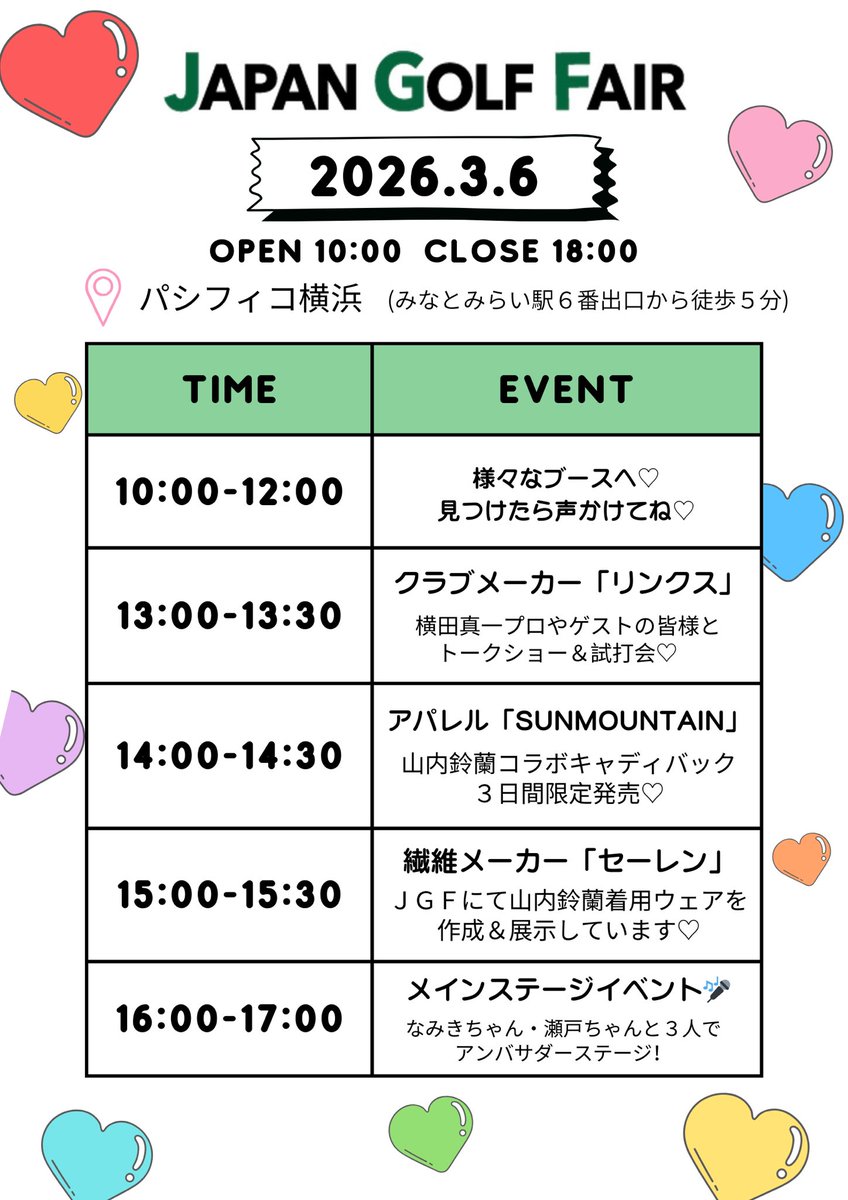 山内鈴蘭イベントスケジュールを作りましたので、是非遊びに来てくださいね💕#ジャパンゴルフフェア2026