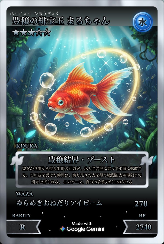 Google Geminiの「ペットカードジェネレーター」がアップデートされたということで我が家の金魚ちゃんで!! 投稿画像でカードの効果も変わり、3枚同時生成なんかもできるみたいです! 皆さんも是非やっちゃって☝️ ナダル https://t.co/SUBnrruCV9 #PR #GoogleGemini #ペットカードジェネレーター https://t.co/0YjWv7TUgD