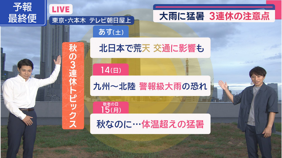 3連休初日は北日本で荒天。雨や風が強まります。あすの夕方から日曜の朝がピークです。交通にも影響がでるかもしれません。連休最終日の敬老の日は晴れる所が多く、関東から四国の太平洋側で再び猛暑。東京は過去最も暑い敬老の日になりそうです。 pic.twitter.com/Mbj5Nbyg1j