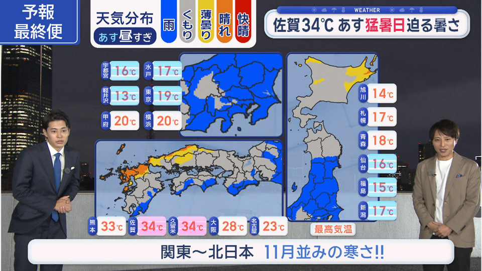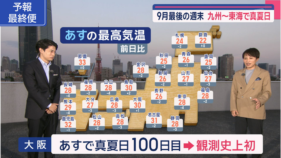 3連休、お出かけする方は行き先の気温に注意です。あす西日本は30度前後で、九州では猛暑日迫る暑さに。一方で関東や東北は20度届かず肌寒く。台風の爪痕が残る伊豆諸島は日曜から月曜にかけて再び台風が直撃する可能性が出てきました。心身ともに大変だと思いますが再び大雨や暴風への警戒が必要です pic.twitter.com/9eeMDFulBV