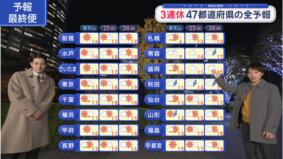 この週末は今年最後の3連休。この秋の連休はなかなか天気に恵まれませんでしたが、今回は全国的によく晴れて行楽日和となりそうです。昼間は日差しが暖かく感じられそうです。月曜日は九州や山陰、東北北部は一時的に雨が降りそうです。よい連休をお過ごし下さい pic.twitter.com/FB75DS1n7W