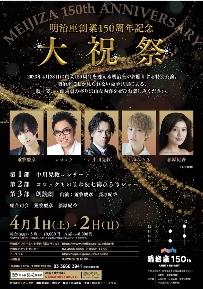 明治座創業150周年記念の一大イベント 大祝祭2日目。ジャンルを越えたエンターテイメントお見逃しなく!当日券もございます。 https://t.co/G9qNDmuPnf