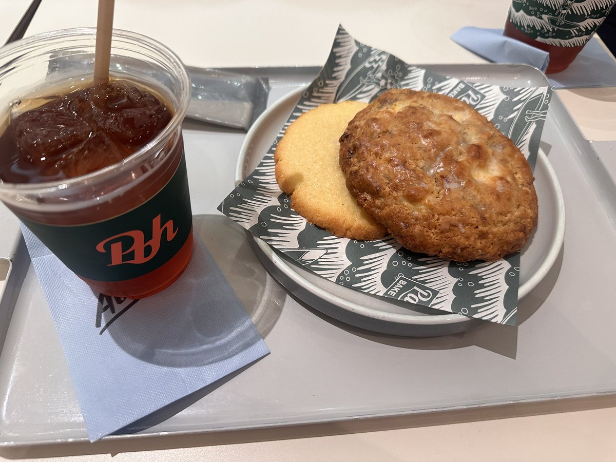 アイスティーとバナナクリームチーズスコーン あんりはココナッツクッキー はるちゃんはバナナブレッド https://t.co/LrxH8R3sgU