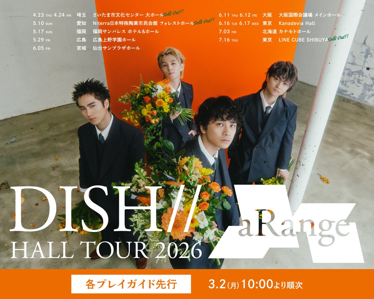 ─────────── DISH// HALL TOUR 2026 "aRange" ─────────── 🎟️最新チケット情報🎟️ 本日3月2日(月) 10:00から 各プレイガイド先行順次受付開始! 東京公演の 注釈付指定席・後方立見席の販売も決定✨ 🧑🏻💻詳しくはこちら https://t.co/gDlC3comZ1 https://t.co/oAxMCRnLQD
