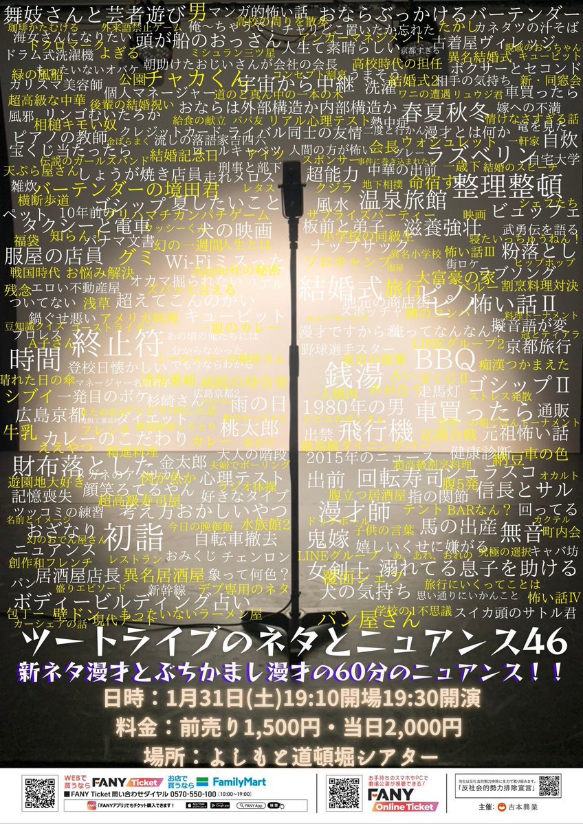 ツートライブのネタニュア46、満員のお客様ありがたすぎるニュアンスでした! 来月は2月23日は森ノ宮でのツートライブの日! 3月はマンゲキにて卒業漫才公演と道頓堀シアターでネタニュア47もあります! 全部来て欲しいニュアンス!!
