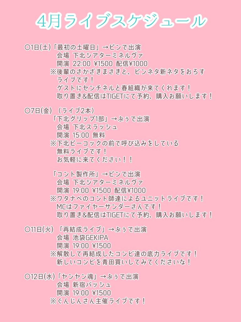 🥲4月のライブスケジュールです!🧚🏻♂️ 是非来てください! ライブが多くてホクホクです☺️ リプ欄にチゲットのURL、ライブのフライヤー載せます! 追加でライブ増えたら都度連絡します! https://t.co/WvpH2qTmLX