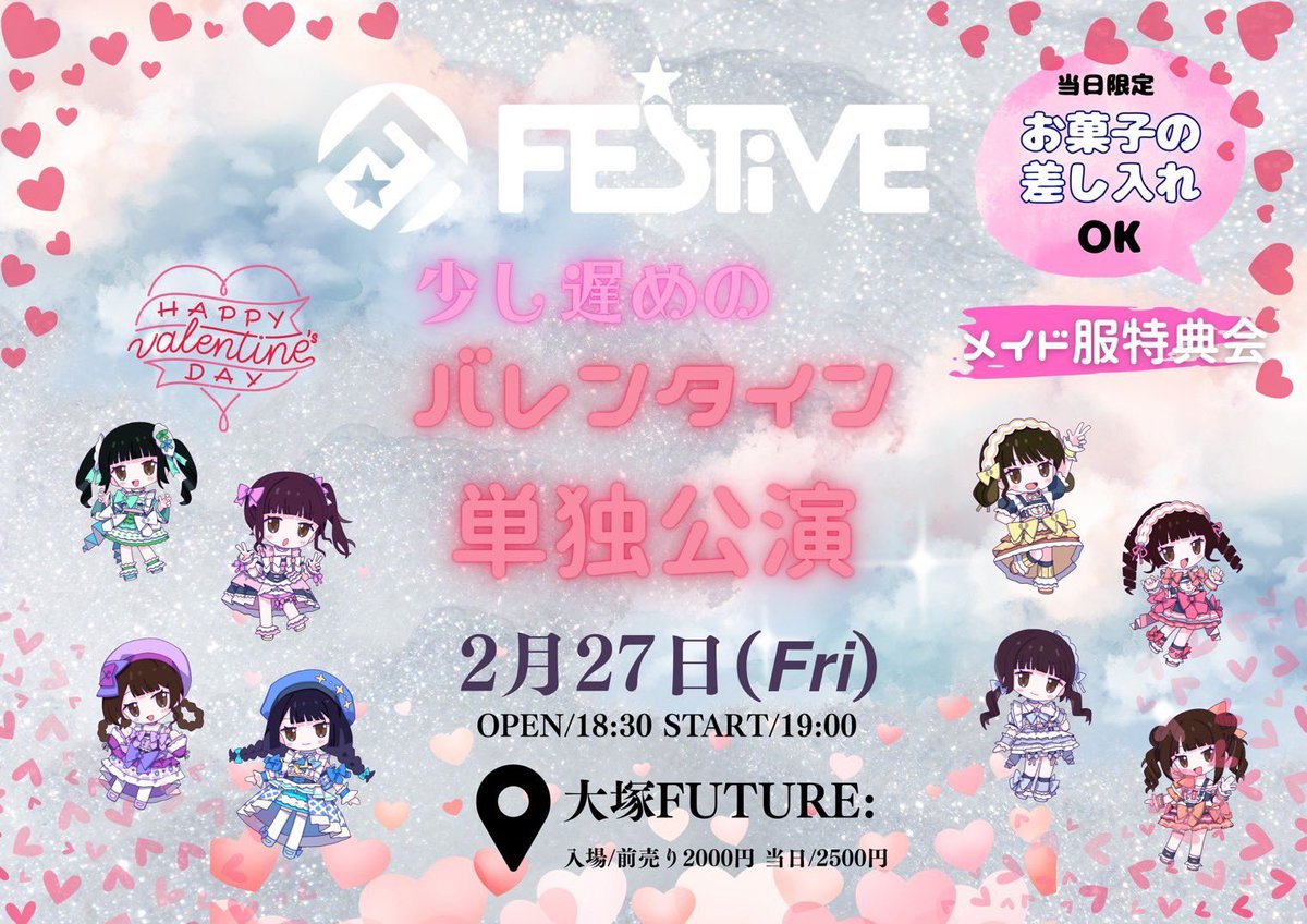 📣New LIVE📣 お菓子の差し入れOK🍬メイド服特典会🎀 2月27日(金) 『FES☆TIVE 少し遅めのバレンタイン単独公演』 📍大塚FUTURE: OP 18:30 / ST 19:00 🎫前方¥2,000 / 当日¥2,500(+1D) 🔗 https://t.co/rJ95swt9zq (2/4 19:00~) https://t.co/SQLgcAGUYC