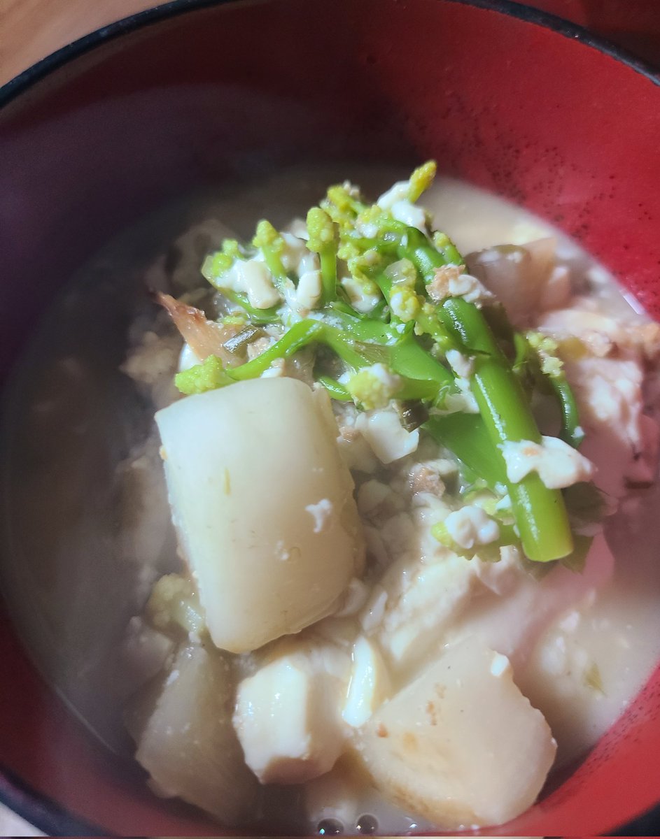 ホワイトデーだよー(^_^)v 収穫したカリフラワーとカブで作った白い汁だよー(v^ー°) メインはお豆腐ですよ(o´艸`o)♪ https://t.co/3VI3ptyt43
