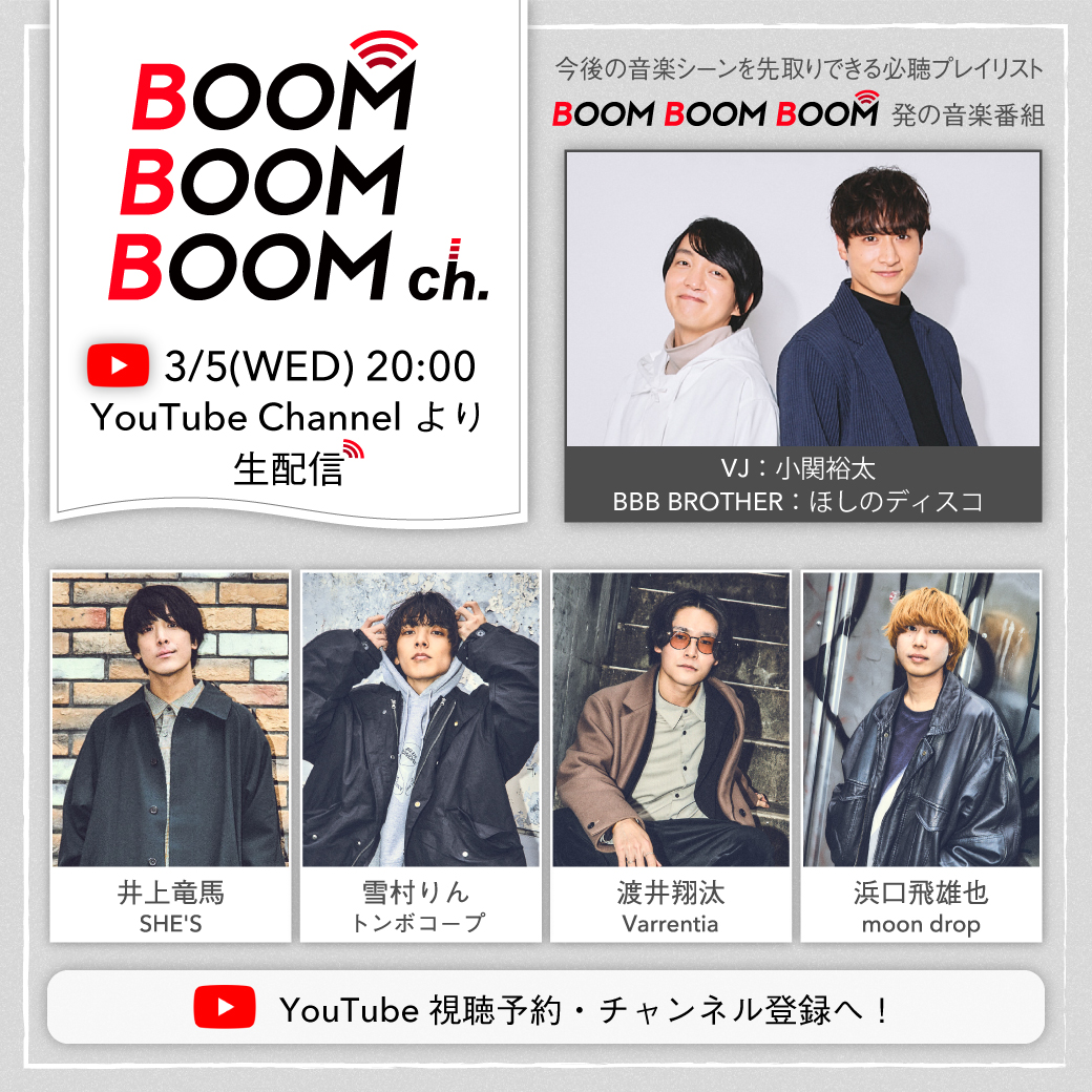 \今夜生配信!!/ 3月5日(金) 20:00~YouTube生配信 『BOOM BOOM BOOM ch.』 #スペシャ が送る音楽シーン先取りプレイリスト "BOOM BOOM BOOM"発の音楽番組 今月末開催のライブイベントに出演する4組のフロントマンが集結🎉 📺視聴 https://t.co/5KQyDkmnqp #SHE_S #BBBch #MAKE_A_BOOM https://t.co/o3mNcZMT8s
