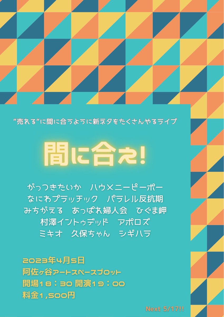 近々のやつです 4/5㊌『間に合え!』阿佐ヶ谷プロット 4/8㊏『ヤッタレ!』渋谷ばぐちか https://t.co/0ajC9dyb6L
