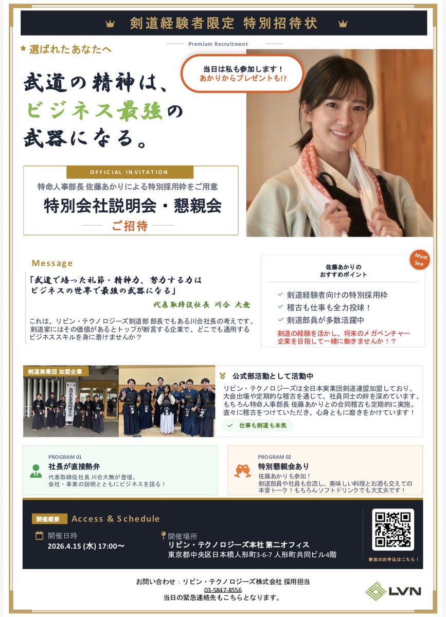 4月15日(水)17:00〜 \リビン・テクノロジーズ株式会社/ 特別会社説明会開催決定 👇お申し込みはこちらから👇 https://t.co/oE5qEVWqVy 剣道経験者・初心者のみなさん お待ちしております😊 当日は私も参加します! プレゼントや特別懇親会も👏 川合社長も登壇します👏 https://t.co/fYSYIZkOwk https://t.co/4I6SReusXp