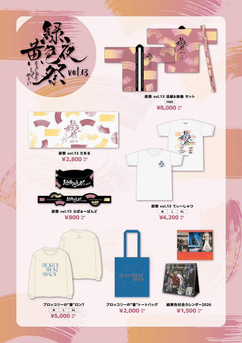 / #緑黄色社会 主催・対バンツアー " #緑黄色夜祭 vol.13” オフィシャルグッズ・ラインナップ解禁🏮 \ ぜひ会場でお買い求めください🛒 🔗https://t.co/Ey2x633RUc #緑黄色社会 #リョクシャカ https://t.co/0cSFhf0hmc