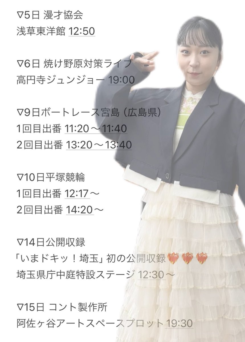 😼11月のライブスケジュール🌟 今月もやります!新ネタライブ!!! 19日「韻波句徒」 新ネタと小道具プレゼント&オークションの祭典!確定で来てほしいです! ▶️https://t.co/OoSwbokU5D そして「いまドキッ埼玉」初の公開収録や 今月もいけるボートレース! しかも超行きたかった宮島!嬉しい! https://t.co/Y9vxhPqDMT