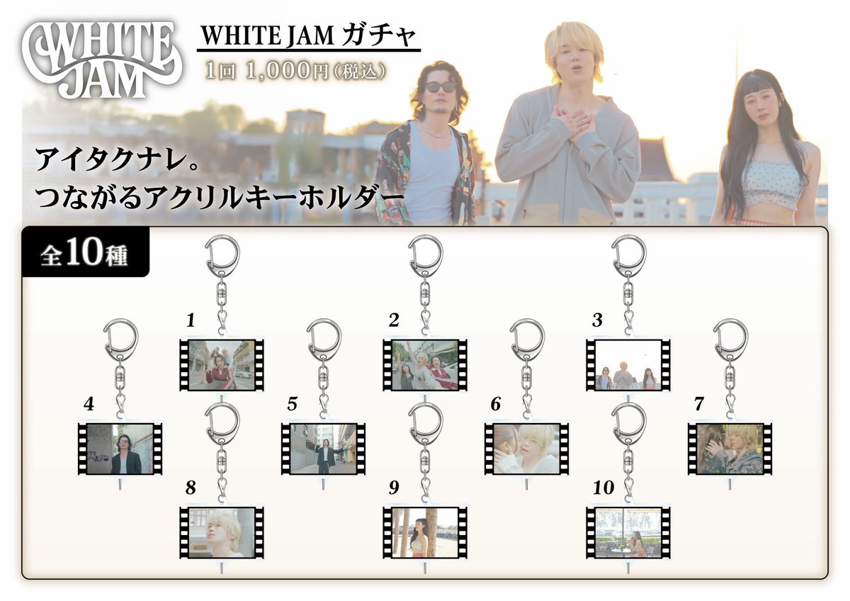 / WHITE JAMオンラインガチャ 本日最終日📣 \ ミュージックビデオ「アイタクナレ。」が キーホルダーとなってガチャガチャに登場! 全種つなげて、ミュージックビデオを完成させよう✨ ▼販売期間 本日23:59まで ▼ガチャページ https://t.co/SKLLjREI8C ※会員登録が必要です https://t.co/6t9Wvkpofe