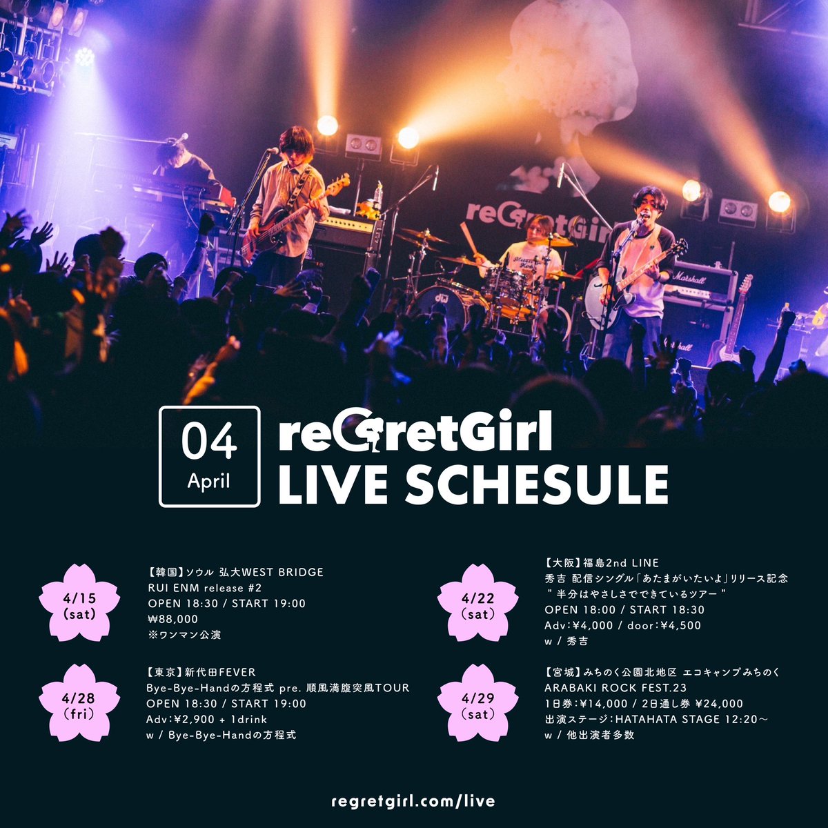 \🌸🎸🌸4月のライブ情報🌸🎸🌸/ reGretGirlの4月のライブはこちら🌞 初の海外 韓国公演も間近!🎉🎉🎉 各地でお会いしましょう〜!👏👏👏 #reGretGirl https://t.co/s44fg5SFib