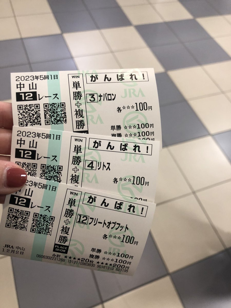 中山最終コラリンの同期応援馬券買ったらリトスの複勝当たった!笑 しかも13番人気ナバロン4着!!どちみち払い戻ししないからいいんだけど😂 https://t.co/DThfwHft28