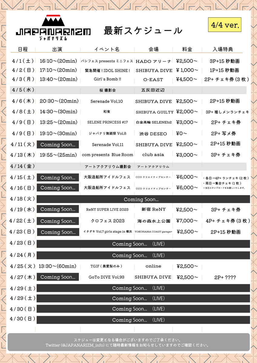 🗓#ジャパナリ最新スケジュール🗓 随時最新スケジュールを更新いたします📷 4/15-16(土)(日) 「大阪造船所アイドルフェス」 4/22(土) 「クロフェス2023」 #ジャパナリ #JAPANARIZM https://t.co/bExosynClb