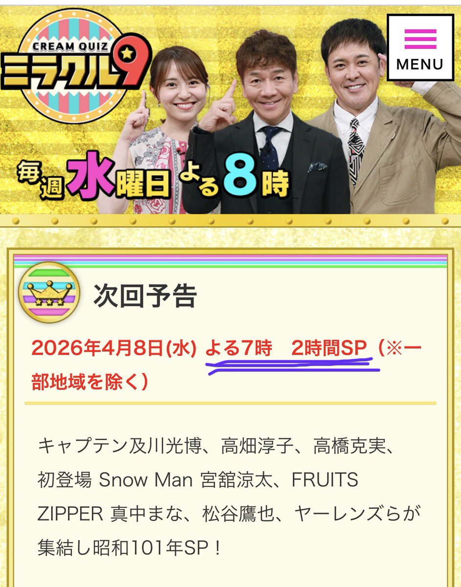 「お知らせ📢」 4/8 19:00〜 ミラクル9に出演させていただきます! 初めてのクイズ番組!しかも1人で! 緊張しましたが、とても楽しかったです🌟 ミラクル9のすぐ後に「ボーダレス」が始まります! 来週水曜日の19:00~はテレビの前に集まりましょう📺 今日も素敵な一日を✨ @miracle_9_ https://t.co/gVKjb1bzDJ